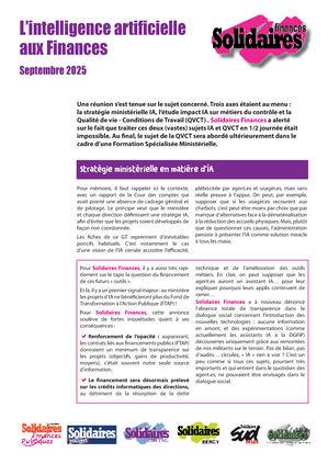 Un groupe de travail s’est tenu sur l'IA au Ministère de l'Economie et des Finances le 26 septembre 2025. Trois axes étaient au menu : la stratégie ministérielle IA, l’étude impact IA sur métiers du contrôle et la Qualité de vie - Conditions de Travail (QVCT). Solidaires Finances a alerté sur le fait que traiter ces deux (vastes) sujets IA et QVCT en 1/2 journée était impossible. Au final, le sujet de la QVCT sera abordé ultérieurement dans le cadre d’une Formation Spécialisée Ministérielle.